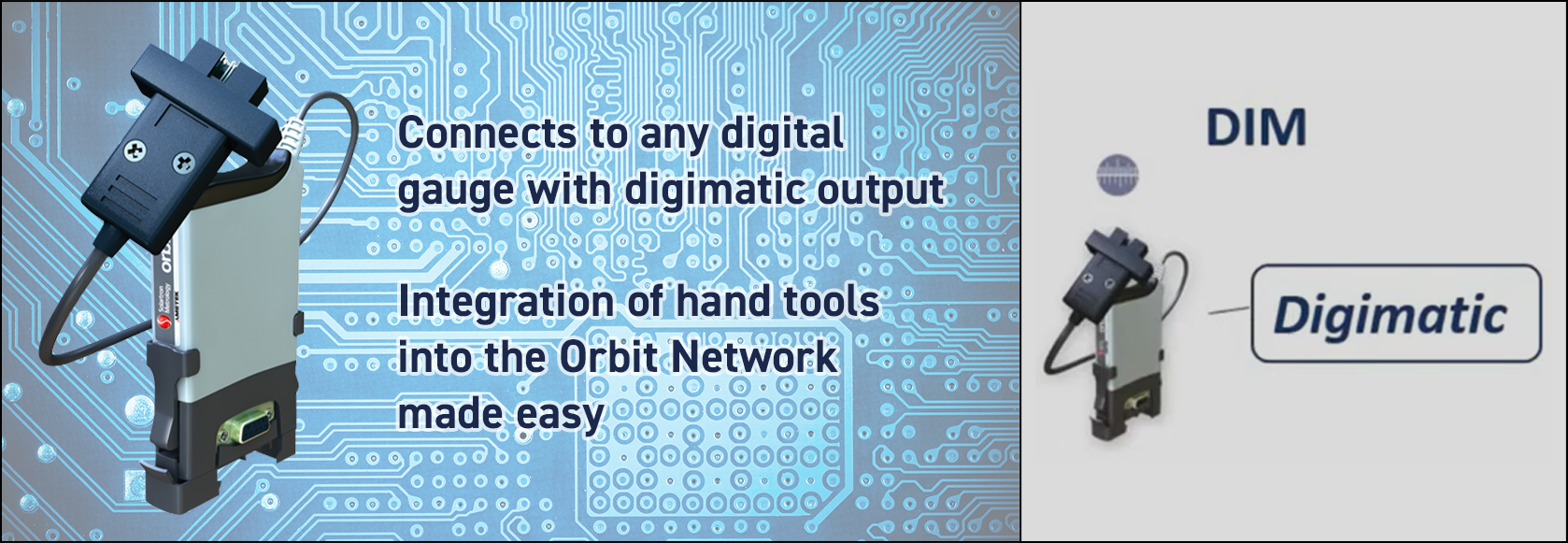 DIM(Digimatic Input Module、デジマチック入力モジュール)は、デジマチック出力のある任意の デジタルゲージに接続するために設計されています。これに より、ハンドツールをOrbit®ネットワークと統合できます。